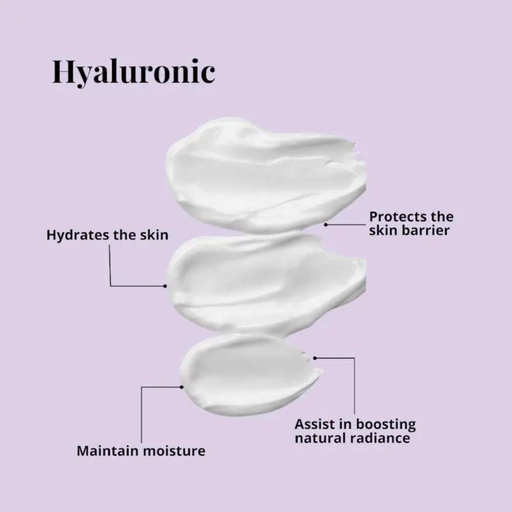 • Hyaluronic acid hydrates and plumps the skin for a smooth texture