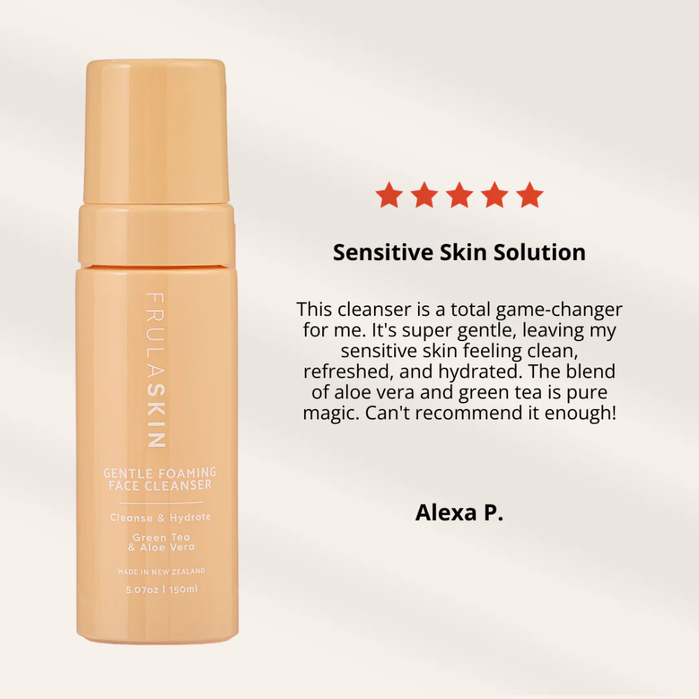 Frula Skin Gentle Foaming Face Cleanser is a lightweight, soothing cleanser that effectively removes dirt, oil, and makeup while calming the skin. Enriched with green tea and aloe vera, it provides antioxidant protection and hydration, leaving skin feeling refreshed, balanced, and comfortable without any tightness.