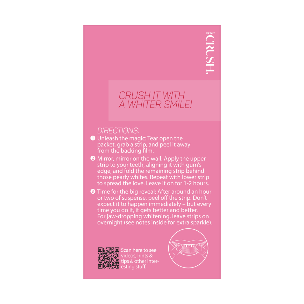 The Piksters Crush Whitening Strips in Watermelon flavour offers an easy and effective way to brighten your smile at home. These flexible strips adhere comfortably to your teeth, helping to reduce surface stains and whiten teeth over the course of the treatment. The refreshing watermelon flavour makes the whitening process more enjoyable.