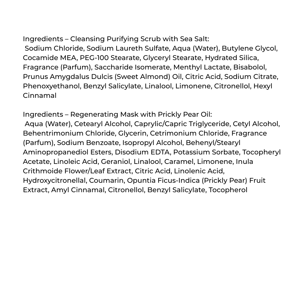 Regenerating Mask with Prickly Pear Oil (40 mL): Apply to damp hair after shampooing. Distribute from root to tip, leave for 23 minutes, then rinse thoroughly.