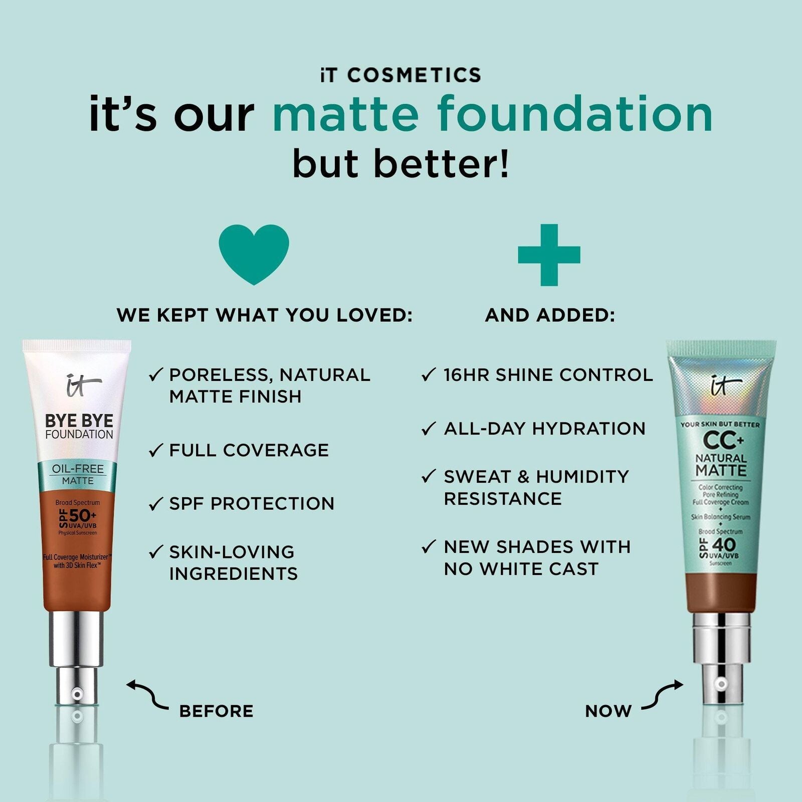 Discover the IT Cosmetics Your Skin But Better CC+ Cream Natural Matte SPF40, the ultimate CC cream for oily skin. This color-correcting foundation offers a shine-free, perfected complexion with a matte finish. Infused with skin-harmonizing serum, it provides full coverage without a flat or mask-like appearance. The matte CC cream camouflages uneven skin tone, redness, and blemishes while delivering long-lasting hydration. Ideal for oily and combination skin types, it keeps shine zones under control and offers full coverage without a flat or mask-like appearance.